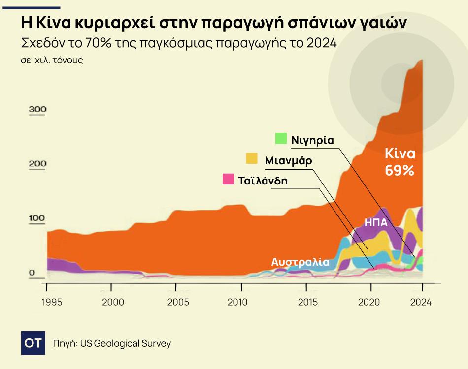 Το 61% της εξορυγμένης παραγωγής σπάνιων γαιών προέρχεται από την Κίνα, σύμφωνα με τον Διεθνή Οργανισμό Ενέργειας, και η χώρα ελέγχει το 92% της παγκόσμιας παραγωγής στο στάδιο της επεξεργασίας.