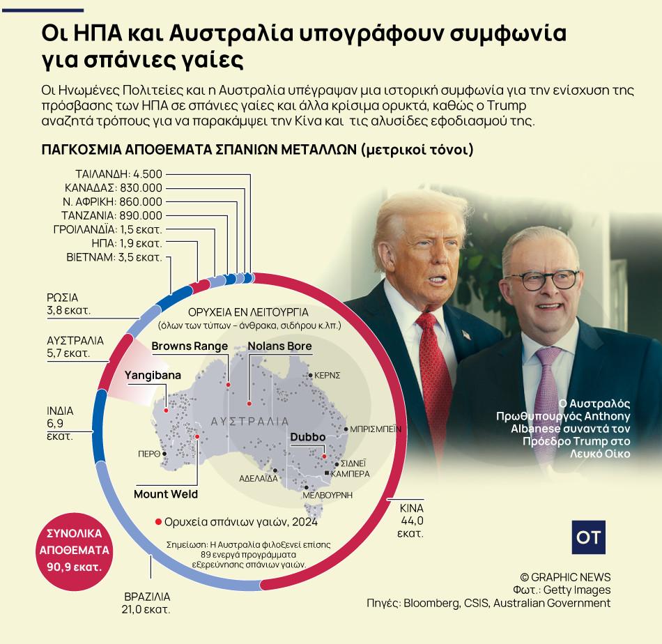 «Σε περίπου ένα χρόνο από τώρα, θα έχουμε τόσα πολλά κρίσιμα ορυκτά και σπάνιες γαίες, που δεν θα ξέρετε τι να τα κάνετε», δήλωσε ο Τραμπ τη Δευτέρα, αφού αποκάλυψε μια συμφωνία 8,5 δισεκατομμυρίων δολαρίων για να βοηθήσει την Αυστραλία να αναπτύξει έργα σπάνιων γαιών και να εξασφαλίσει την πρόσβαση των Ηνωμένων Πολιτειών σε αυτά τα στοιχεία.