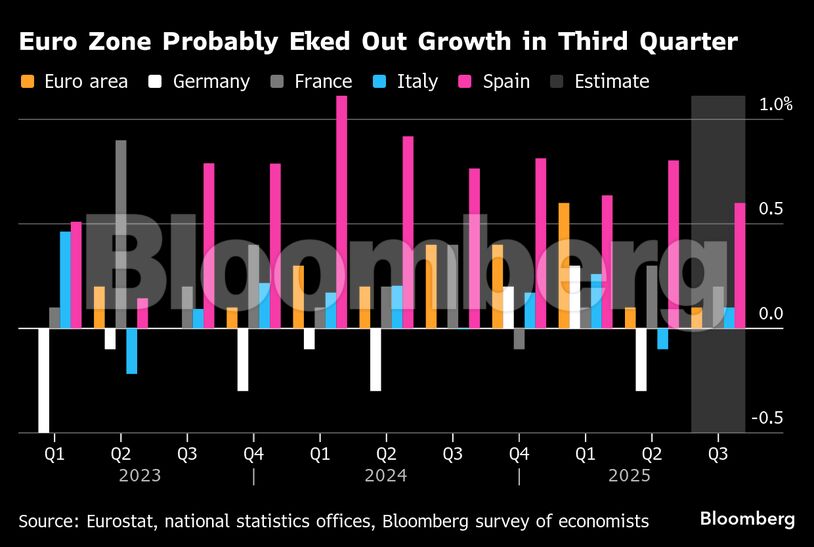 Οι αναλυτές εκτιμούν ότι η οικονομία της Ευρωζώνης θα παραμείνει στάσιμη, με οριακή αύξηση 0,1%, παρόμοια με εκείνη του β’ τριμήνου. Τα εθνικά στοιχεία από τις μεγαλύτερες οικονομίες της περιοχής αναμένεται να δώσουν πιο λεπτομερή εικόνα για τη δυναμική της ανάπτυξης.