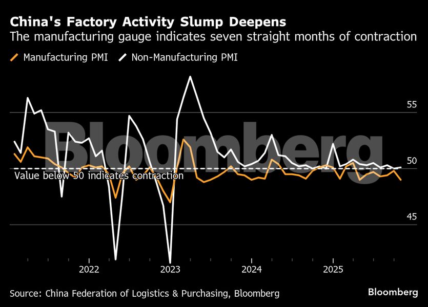 Σύμφωνα με τα τελευταία στοιχεία του Εθνικού Στατιστικού Γραφείου, ο PMI στη μεταποίηση μειώθηκε περισσότερο απ’ ό,τι ανέμεναν οι αγορές, υποχωρώντας στις 49 μονάδες τον Οκτώβριο. Το αποτέλεσμα σηματοδοτεί το χαμηλότερο επίπεδο δραστηριότητας των τελευταίων έξι μηνών λίγο πριν τη συνάντηση κορυφής που στόχευε στη σταθεροποίηση των σινοαμερικανικών σχέσεων. Οι νέες παραγγελίες παρουσίασαν τη μεγαλύτερη πτώση από το 2023, δείχνοντας την επίδραση των εμπορικών περιορισμών και της μειωμένης εμπιστοσύνης στην εσωτερική αγορά.