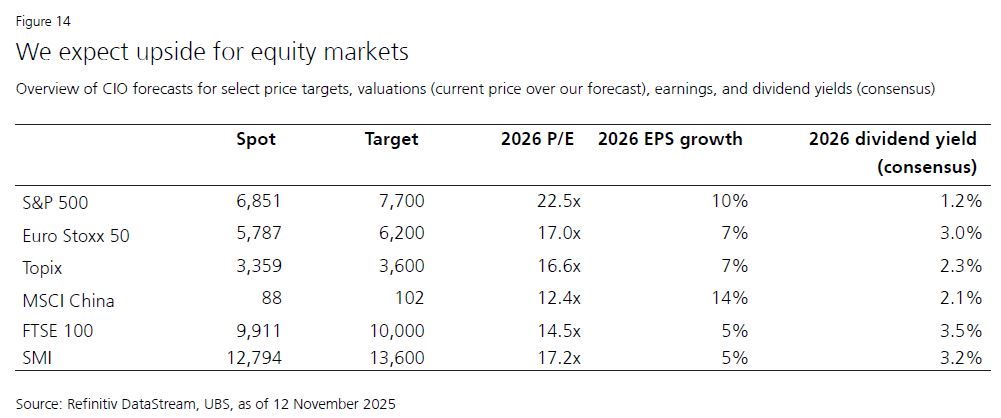 Αναζήτηση ευκαιριών στην Κίνα: Ο τεχνολογικός τομέας της Κίνας ξεχωρίζει ως μια κορυφαία παγκόσμια ευκαιρία. Η ισχυρή ρευστότητα, οι ροές λιανικής και τα κέρδη που αναμένεται να αυξηθούν στο 37% το 2026 θα πρέπει να διατηρήσουν τη δυναμική για τις κινεζικές μετοχές. Η ευρύτερη έκθεση στην Ασία, ιδίως στην Ινδία και τη Σιγκαπούρη, θα μπορούσε να προσφέρει πρόσθετα οφέλη για τους επενδυτές που επιδιώκουν διαφοροποίηση, όπως και οι αναδυόμενες αγορές.