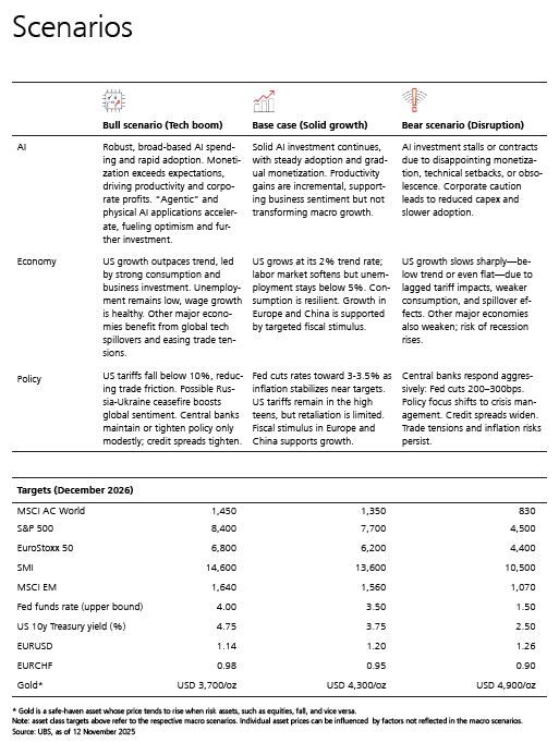 Ο Mark Haefele, Διευθυντής Επενδύσεων της UBS GWM, δηλώνει: «Καθώς κοιτάμε προς το 2026, το ερώτημα είναι κατά πόσον οι ισχυρές δυνάμεις της Τεχνητής Νοημοσύνης, της δημοσιονομικής τόνωσης και της χαλάρωσης της νομισματικής πολιτικής είναι ικανές να ωθήσουν τις παγκόσμιες αγορές -πέρα από τη σοβαρότητα του χρέους, των δημογραφικών στοιχείων και της απο-παγκοσμιοποίησης- προς μια νέα εποχή ανάπτυξης. Ο δρόμος εν μέσω των διαρθρωτικών αυτών αλλαγών απαιτεί από τους επενδυτές να προσαρμόσουν τις στρατηγικές τους, εστιάζοντας σε τομείς και θέματα όπου ρέει κεφάλαιο και λαμβάνει χώρα μετασχηματισμός».