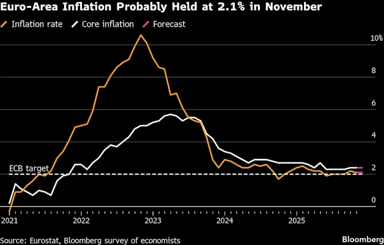 Οι τιμές καταναλωτή στην ευρωζώνη πιθανότατα αυξήθηκαν κατά 2,1% τον Νοέμβριο σε σχέση με τον προηγούμενο χρόνο -σύμφωνα με τον μέσο όρο 29 προβλέψεων σε έρευνα του Bloomberg πριν από την ανακοίνωση των στοιχείων την Τρίτη. Ο υποκείμενος δείκτης, ο οποίος εξαιρεί τα ευμετάβλητα στοιχεία όπως η ενέργεια, αναμένεται να παραμείνει στο 2,4%.