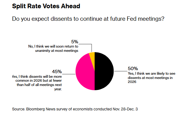 Τα τελευταία χρόνια, η κεντρική τράπεζα των ΗΠΑ έχει λάβει αποφάσεις νομισματικής πολιτικής με συναίνεση. Σύμφωνα με την έρευνα, σχεδόν όλοι οι οικονομολόγοι θεωρούν πλέον ότι η Ομοσπονδιακή Επιτροπή Ανοικτής Αγοράς (FOMC) μεταβαίνει σε μια διαδικασία που χαρακτηρίζεται από την αρχή της πλειοψηφίας, αν και οι ερωτηθέντες ήταν ομοιόμορφα διχασμένοι ως προς το αν στις περισσότερες συνεδριάσεις του 2026 θα υπάρξουν διαφωνούντες.
