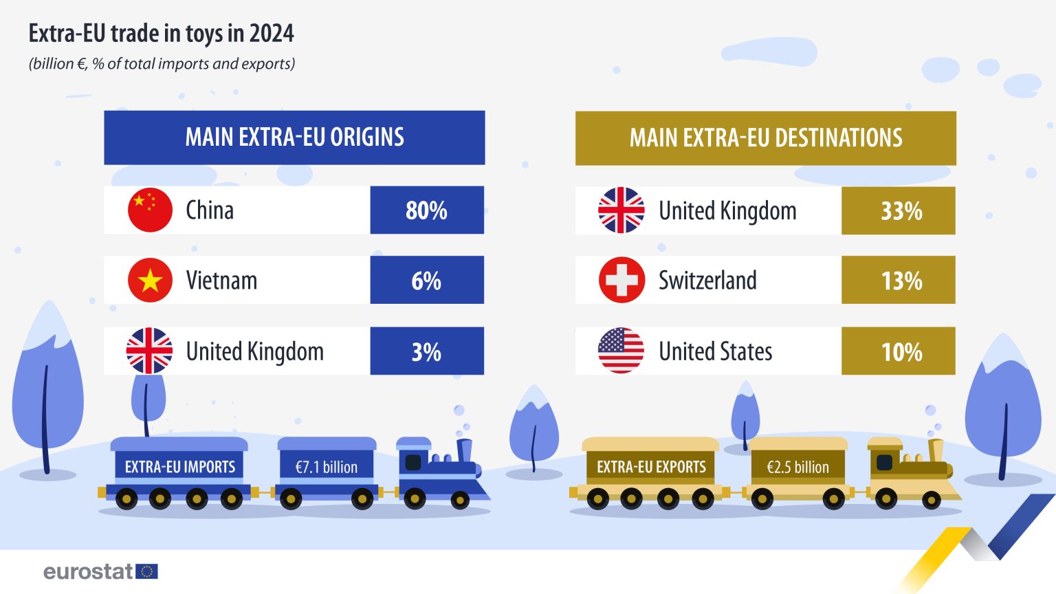 Η Κίνα ήταν ο μεγαλύτερος προμηθευτής παιχνιδιών στην ΕΕ με 80% (αξίας 5,6 δισ. ευρώ) των εισαγωγών παιχνιδιών, πολύ μπροστά από το Βιετνάμ που είχε μερίδιο 6% (418 εκατ. ευρώ) και τη Βρετανία (3%, 188 εκατ. ευρώ).