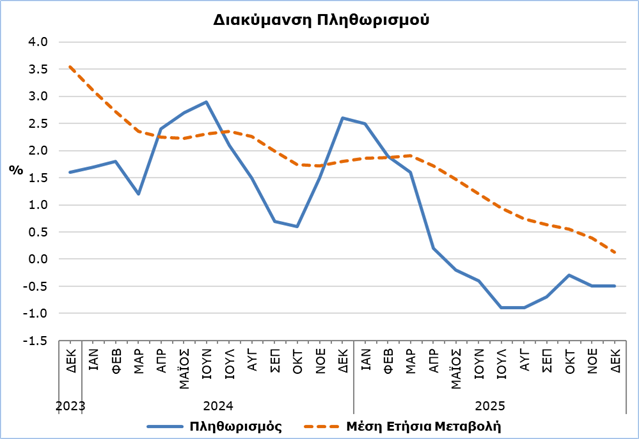 Για την περίοδο Ιανουαρίου – Δεκεμβρίου 2025, σε σύγκριση με την αντίστοιχη περσινή περίοδο, οι μεγαλύτερες μεταβολές παρουσιάστηκαν στις κατηγορίες Ένδυση και Υπόδηση (-6,5%), Εστιατόρια και Ξενοδοχεία (4,7%), Εκπαίδευση (3,7%) και Αναψυχή και Πολιτισμός (3,1%).