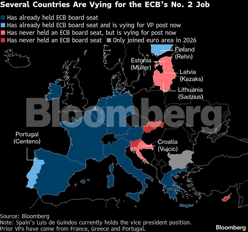 Υποψήφιοι από τη Λιθουανία, την Εσθονία, τη Λετονία και την Κροατία διεκδικούν επίσης τη θέση του αντιπροέδρου Λουίς Ντε Γκίντος, ο οποίος αποχωρεί τον Μάιο. Στην πρόκληση προστίθεται και ο επικεφαλής της κεντρικής τράπεζας της Φινλανδίας Όλι Ρεν, πρώην ευρωπαίος επίτροπος που θεωρείται ισχυρός υποψήφιος για την αντιπροεδρία.