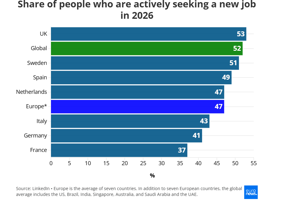 Σύμφωνα με την έρευνα που κοινοποιήθηκε στο Euronews Business, το Ηνωμένο Βασίλειο έχει το υψηλότερο ποσοστό ατόμων που θα αναζητήσουν νέο ρόλο στο νέο έτος, σε σύγκριση με επτά άλλες ευρωπαϊκές χώρες. Πάνω από τους μισούς ερωτηθέντες στο Ηνωμένο Βασίλειο απάντησαν «ναι» όταν ρωτήθηκαν αν σκοπεύουν να ψάξουν για νέα δουλειά το 2026.