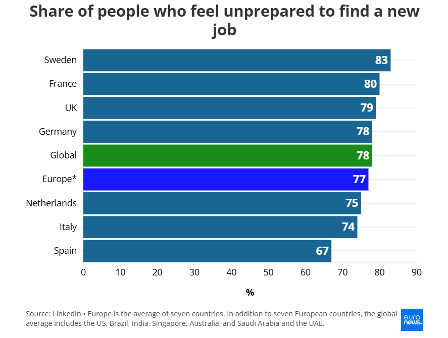 Παρότι σχεδόν οι μισοί Ευρωπαίοι σκοπεύουν να αναζητήσουν νέο ρόλο το 2026, σχεδόν τέσσερις στους πέντε δηλώνουν ότι αισθάνονται ανέτοιμοι να βρουν νέα δουλειά. Το αίσθημα αυτό είναι εντονότερο στη Σουηδία, όπου το 83% δηλώνει ότι νιώθει ανέτοιμο.