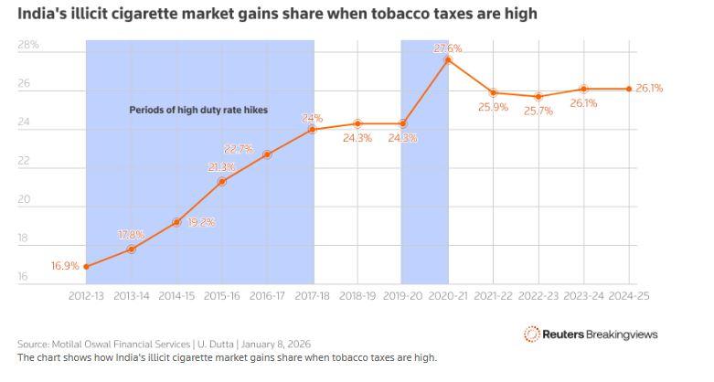 Οι καπνοβιομηχανίες είναι συνηθισμένες να επιβαρύνονται με φόρους «αμαρτίας» όταν τα έσοδα του κράτους χρειάζονται ενίσχυση. Τα καπνικά προϊόντα υπόκεινται ήδη σε φόρο 40% μετά την αναπροσαρμογή των φόρων επί των αγαθών και των υπηρεσιών πέρυσι. Η τελευταία αύξηση ανεβάζει τον συνολικό φόρο επί των τσιγάρων σε περίπου 50%, σύμφωνα με την χρηματιστηριακή εταιρεία Motilal Oswal. Οι αναλυτές αντέδρασαν αναθεωρώντας προς τα κάτω τις αναμενόμενες πωλήσεις τσιγάρων της ITC κατά 13% για τα επόμενα δύο πλήρη οικονομικά έτη, σύμφωνα με την, S&P Global. Ωστόσο, αντί να σταματήσουν το κάπνισμα, οι περισσότεροι πελάτες θα στραφούν απλώς σε παράνομα τσιγάρα που διατίθενται στη μαύρη αγορά.