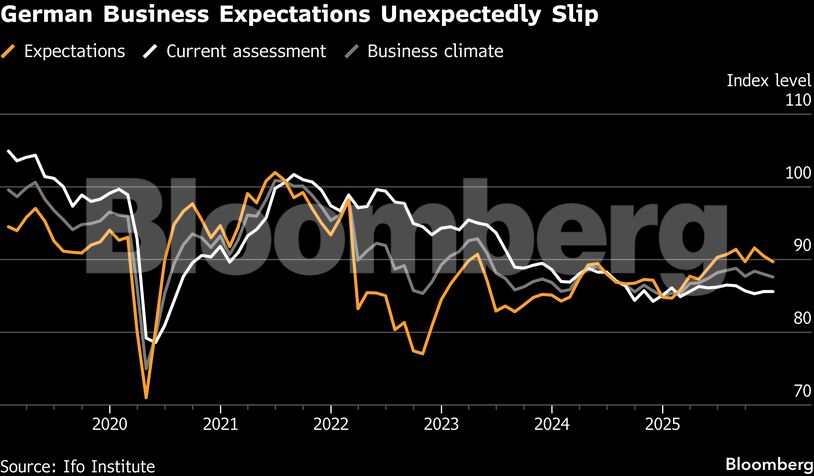 Ο δείκτης προσδοκιών του ινστιτούτου Ifo υποχώρησε τον Ιανουάριο στις 89,5 μονάδες από 89,7 τον Δεκέμβριο, σύμφωνα με έκθεση που δημοσιεύθηκε τη Δευτέρα. Οι οικονομολόγοι που συμμετείχαν σε έρευνα του Bloomberg ανέμεναν άνοδο στις 90,3 μονάδες. Αντίθετα, ο δείκτης που αποτυπώνει τις τρέχουσες συνθήκες σημείωσε οριακή βελτίωση.