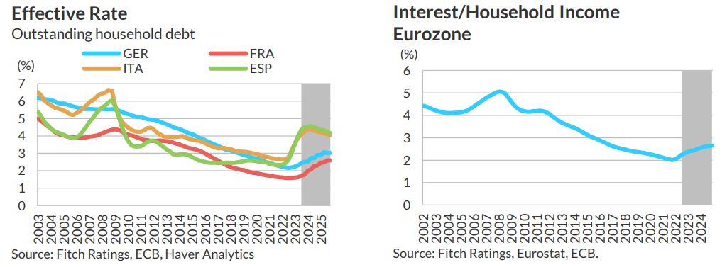 Ο επιθετικός κύκλος νομισματικής σύσφιγξης της Ευρωπαϊκής Κεντρικής Τράπεζας, με αυξήσεις επιτοκίων κατά 450 μονάδες βάσης από τον Ιούλιο του 2022 έως τον Σεπτέμβριο του 2023, έχει προκαλέσει μία ήπια μόνο αύξηση στις πληρωμές τόκων των νοικοκυριών, όταν αυτές μετρώνται σαν μέρος του συνολικού εισοδήματός τους, σημειώνουν οι αναλυτές. Η Fitch εκτιμά ότι οι επιπτώσεις στην κατανάλωση των νοικοκυριών και στην ανάπτυξη θα εξακολουθήσουν να είναι διαχειρίσιμες.