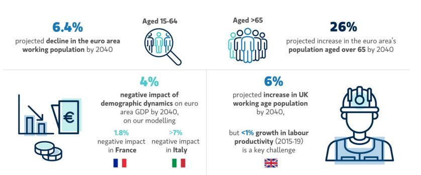 Από την ανάλυση προκύπτει ότι η Γερμανία, το Ηνωμένο Βασίλειο και η Ισπανία θα έβλεπαν το μεγαλύτερο όφελος εάν ανάμεσα στις 3 προτεινόμενες πολιτικές επέλεγαν την αύξηση της μετανάστευσης. Στη Γαλλία, το μεγαλύτερο όφελος για το ΑΕΠ θα καταγραφόταν εάν η χώρα έκλεινε το χάσμα με τη Γερμανία στην ηλικία συνταξιοδότησης. Η Ιταλία θα ωφελούνταν περισσότερο από την αύξηση της συμμετοχής των γυναικών στην αγορά εργασίας.