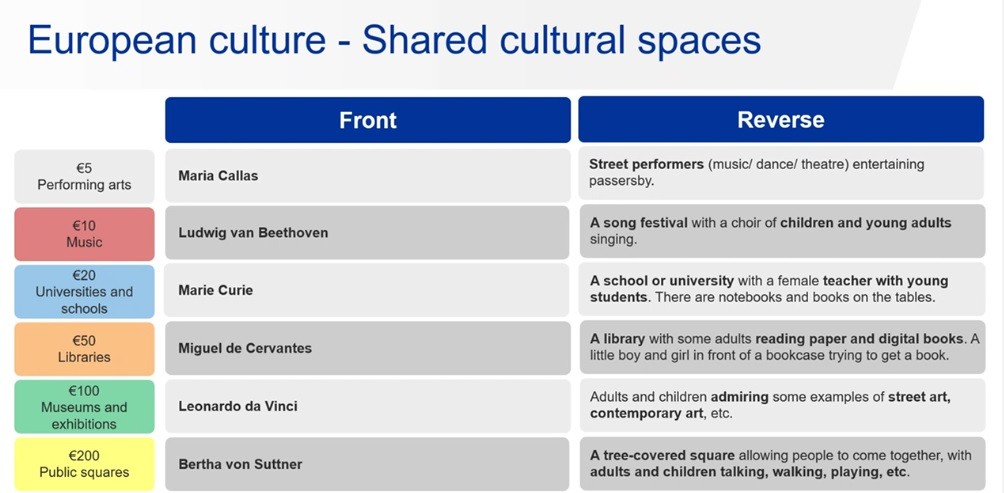 Ο «ευρωπαϊκός πολιτισμός» εξυμνεί τους κοινούς πολιτιστικούς χώρους που διαμόρφωσαν την ευρωπαϊκή ταυτότητα ανά τους αιώνες. Τα μοτίβα αυτού του θέματος απεικονίζουν διάφορες πολιτιστικές δραστηριότητες και χώρους, καθώς και εμβληματικές ευρωπαϊκές προσωπικότητες που συνέβαλαν στην οικοδόμηση της πολιτιστικής κληρονομιάς της Ευρώπης. Οι ζωές τους καλύπτουν έξι αιώνες, κατά τη διάρκεια των οποίων έζησαν, ταξίδεψαν και εργάστηκαν σε ολόκληρη την ήπειρό μας, και τα επιτεύγματά τους έχουν βρει απήχηση σε όλο τον κόσμο.