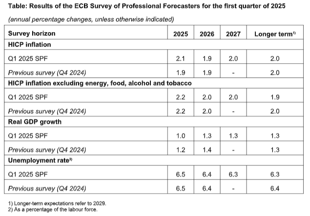 Οι εμπειρογνώμονες ανέμεναν αύξηση του πραγματικού ΑΕΠ κατά 1% το 2025 και 1,3% τόσο το 2026 όσο και το 2027. Σε σύγκριση με την προηγούμενη έρευνα, οι εκτιμήσεις αναθεωρήθηκαν προς τα κάτω κατά 0,2 ποσοστιαίες μονάδες για το 2025 και κατά 0,1 π.μ. για το 2026.