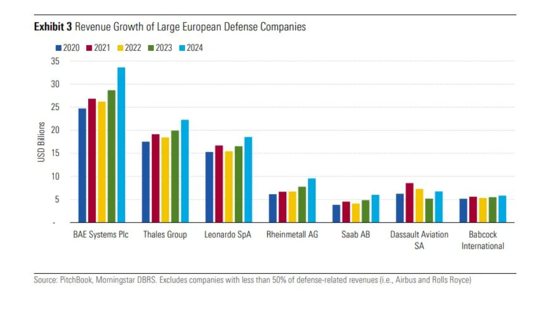 Η BAE Systems προβλέπει ενίσχυση εσόδων 7%-9% το 2025, ενώ η Thales αναμένει ρυθμούς αύξησης 5%-6%, οδηγώντας τις πωλήσεις περίπου στα 36 δισ. ευρώ και 22 δισ. ευρώ αντίστοιχα.