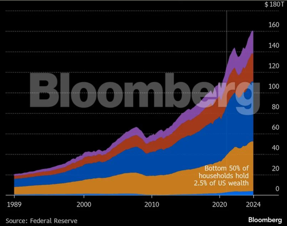Οι μισές αμερικανικές οικογένειες είχαν στα χέρια τους το 97,5% του εθνικού πλούτου στα τέλη του 2024, ενώ το άλλο μισό των φτωχότερων οικογενειών κατείχε το 2,5%, σύμφωνα με τα τελευταία στοιχεία της Ομοσπονδιακής Τράπεζας των ΗΠΑ.