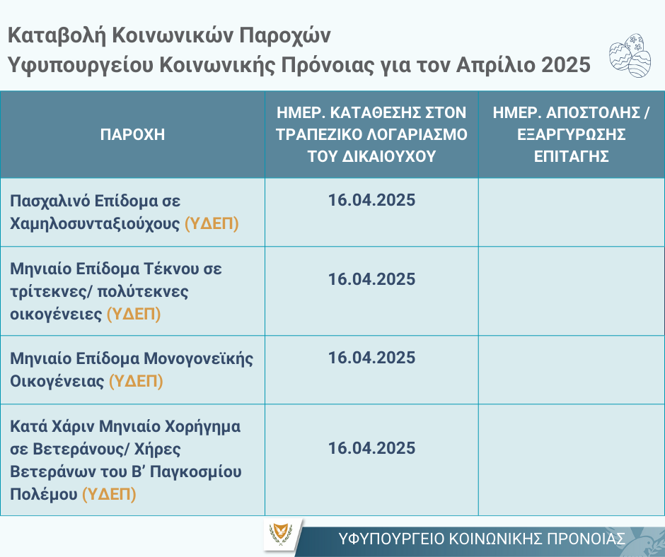 Συγκεκριμένα ενόψει των εορτών του Πάσχα το Υφυπουργείο Κοινωνικής Πρόνοιας ανακοίνωσε πως οι Υπηρεσίες Κοινωνικής Ευημερίας (ΥΚΕ), η Υπηρεσία Διαχείρισης Επιδομάτων Πρόνοιας (ΥΔΕΠ) και το Τμήμα Κοινωνικής Ενσωμάτωσης Ατόμων με Αναπηρίες (TKEAA) έχουν προβεί σε όλες τις απαραίτητες διευθετήσεις για νωρίτερη καταβολή των επιδομάτων και άλλων κοινωνικών παροχών. Η καταβολή των επιδομάτων θα γίνει ως φαίνεται στους πιο κάτω πίνακες: