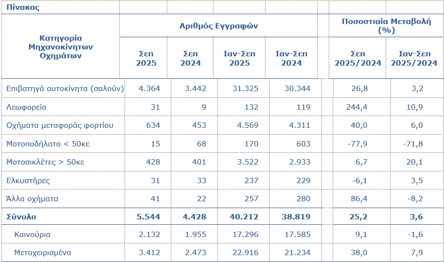 - (ζ) Οι εγγραφές μοτοσικλετών > 50κε αυξήθηκαν κατά 20,1% στις 3.522 την περίοδο Ιανουαρίου- Σεπτεμβρίου 2025, σε σύγκριση με 2.933 την ίδια περίοδο του 2024.