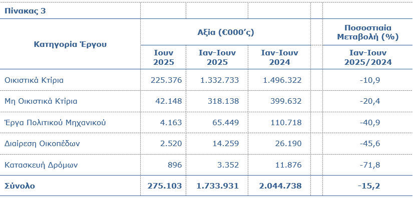 Κατά την περίοδο Ιανουαρίου-Ιουνίου 2025 εκδόθηκαν 3.399 άδειες οικοδομής σε σύγκριση με 4.782 την αντίστοιχη περίοδο του προηγούμενου έτους, σημειώνοντας μείωση 28,9%. Η συνολική αξία των αδειών αυτών μειώθηκε κατά 15,2% και το συνολικό εμβαδόν κατά 12,4%. Ο αριθμός των οικιστικών μονάδων παρουσίασε μείωση της τάξης του 13,1%.