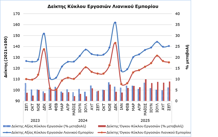 Κατά τον ίδιο μήνα ο Δείκτης Όγκου Κύκλου Εργασιών Λιανικού Εμπορίου αυξήθηκε κατά 9,0% σε σύγκριση με τον αντίστοιχο μήνα του προηγούμενου έτους.