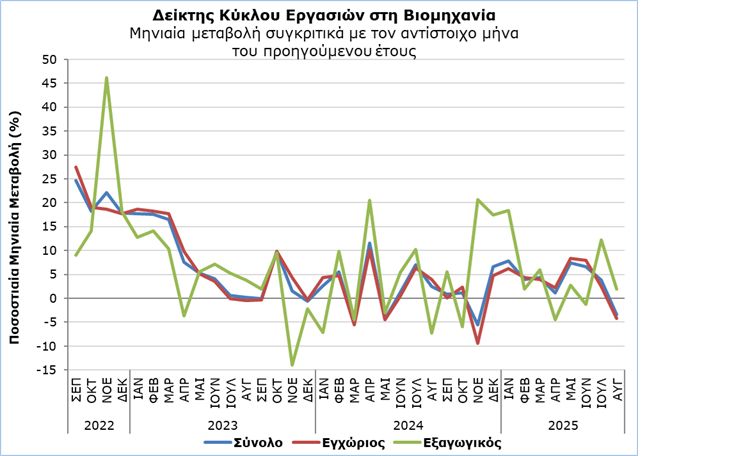 Αύξηση 4% παρουσίασε ο Δείκτης Κύκλου Εργασιών στη Βιομηχανία την περίοδο Ιανουαρίου-Αυγούστου 2025, σύμφωνα με στοιχεία που δημοσίευσε, την Τετάρτη, η Στατιστική Υπηρεσία.