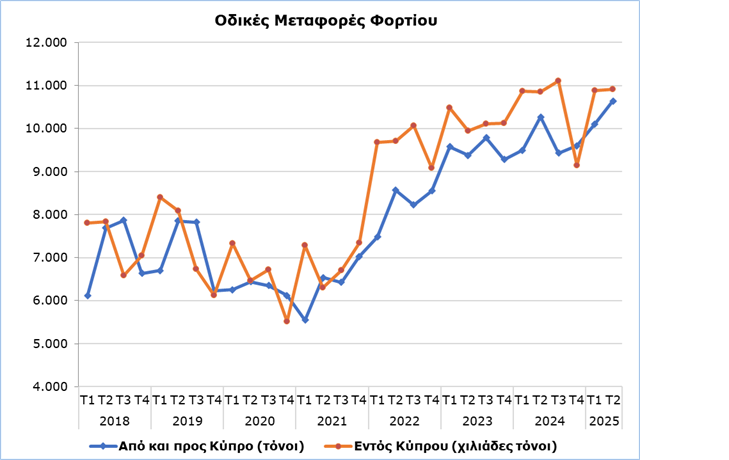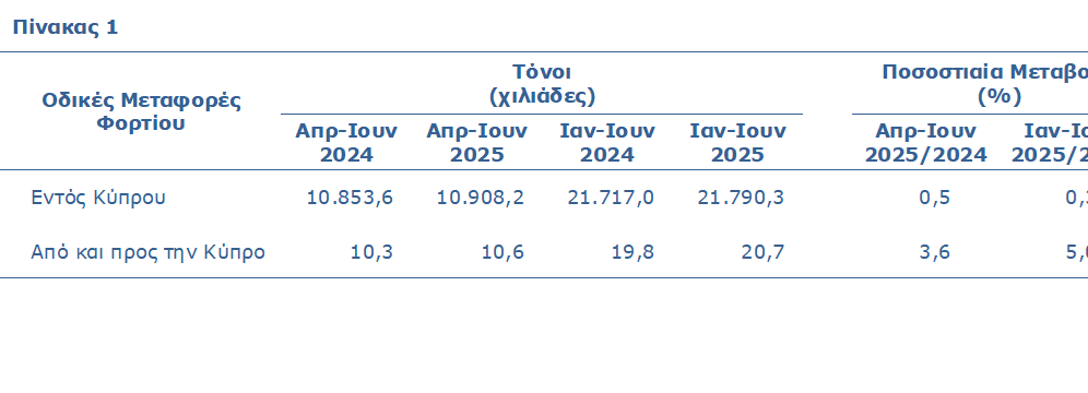 Το συνολικό βάρος των προϊόντων που μεταφέρθηκαν οδικώς εντός Κύπρου παρουσίασε ελαφρά αύξηση 0,5% σε σύγκριση με την αντίστοιχη περίοδο του 2024, ενώ μεγαλύτερη άνοδο σημείωσε από και προς την Κύπρο