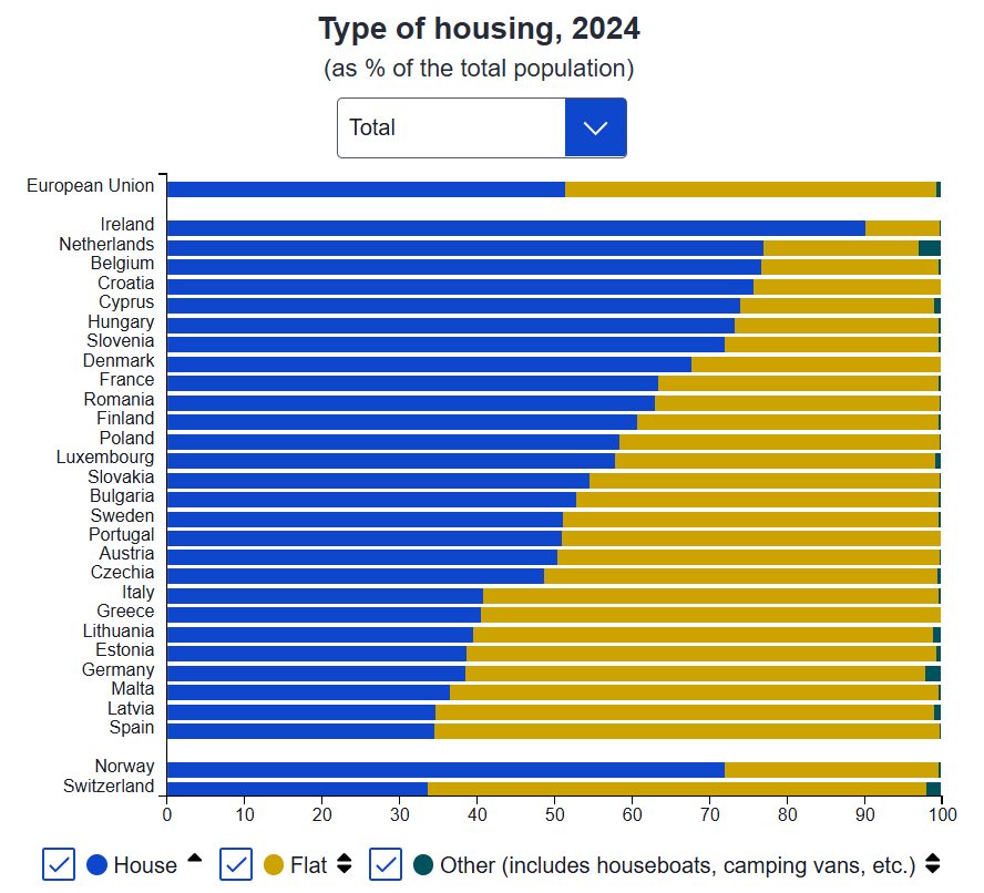 Στην ΕΕ το 51% του πληθυσμού ζούσε σε σπίτια, το 48% σε διαμερίσματα και το υπόλοιπο 1% σε άλλα καταλύματα όπως σε πλωτά σπίτια ή σε τροχόσπιτα.
