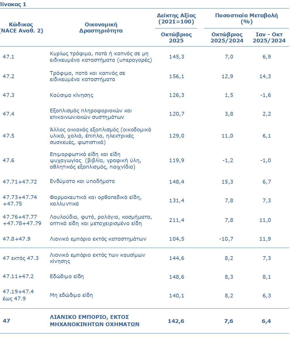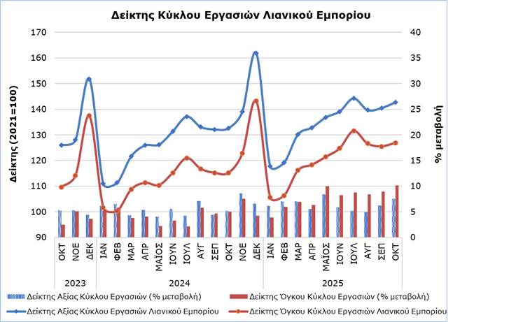 Ο Δείκτης Αξίας Κύκλου Εργασιών Λιανικού Εμπορίου αυξήθηκε τον Οκτώβριο 2025 κατά 7,6% σε σύγκριση με τον αντίστοιχο μήνα του προηγούμενου έτους. Κατά τον ίδιο μήνα ο Δείκτης Όγκου Κύκλου Εργασιών Λιανικού Εμπορίου αυξήθηκε κατά 10,1% σε σύγκριση με τον αντίστοιχο μήνα του προηγούμενου έτους, σύμφωνα με τα στοιχεία που δημοσίευσε σήμερα η Στατιστική Υπηρεσία.