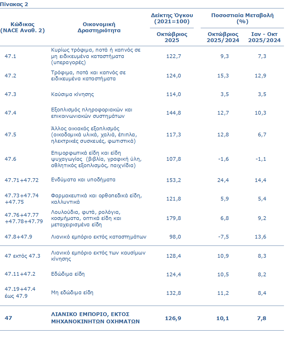 Ο Δείκτης Αξίας κατέγραψε ετήσια αύξηση 7,6%, ενώ ο Δείκτης Όγκου σημείωσε άνοδο 10,1% σε σχέση με τον Οκτώβριο 2024