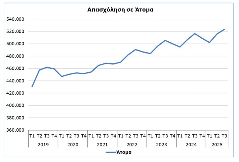 Το σύνολο των εργαζομένων που απασχολούνταν κατά το 3ο τρίμηνο του 2025 υπολογίζεται στα 523.510 άτομα, εκ των οποίων 470.755 είναι υπάλληλοι και 52.755 αυτοαπασχολούμενοι, σύμφωνα με στοιχεία που δημοσίευσε σήμερα η Στατιστική Υπηρεσία.