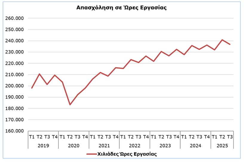 Οι πραγματικές ώρες εργασίας για το 3ο τρίμηνο του 2025 υπολογίζονται στις 236.757 χιλιάδες, με ποσοστό αύξησης 1,9% σε σχέση με το αντίστοιχο τρίμηνο του 2024. Οι σημαντικότερες ποσοστιαίες αυξήσεις παρατηρήθηκαν στους τομείς του Χονδρικού και Λιανικού Εμπορίου, Επισκευή μηχανοκινήτων οχημάτων (NACE G), Ξενοδοχεία και Εστιατόρια (NACE I) και της Μεταποίησης (NACE C).