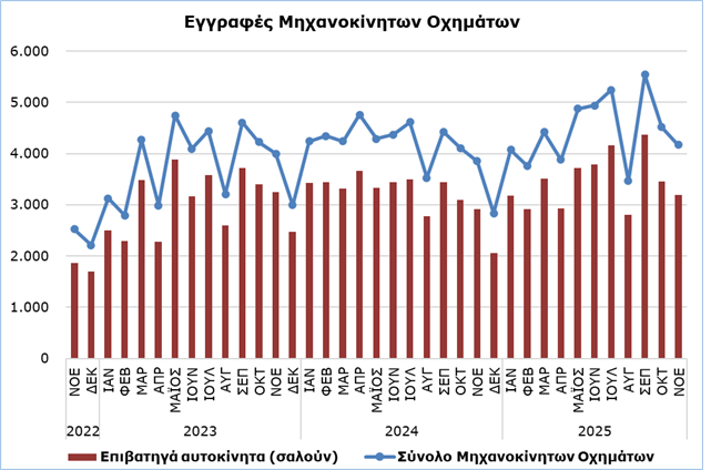 (ζ) Οι εγγραφές μοτοσικλετών > 50κε αυξήθηκαν κατά 16,6% στις 4.264 την περίοδο Ιανουαρίου-Νοεμβρίου 2025, σε σύγκριση με 3.657 την ίδια περίοδο του 2024.