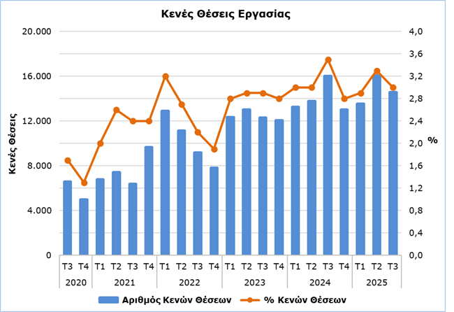 Το ποσοστό των κενών θέσεων ως προς το σύνολο των υπαλλήλων και των κενών θέσεων κατά το 3ο τρίμηνο του 2025 ήταν μόλις 3%, ενώ το προηγούμενο τρίμηνο και το αντίστοιχο τρίμηνο του 2024 ήταν 3,3% και 3,5% αντίστοιχα.
