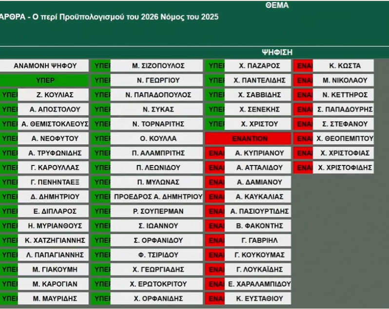 Υπερψηφίστηκε ο κρατικός προϋπολογισμός για το 2026