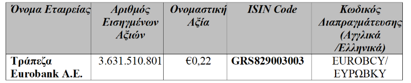 Συγκεκριμένα η «Τράπεζα Eurobank Ανώνυμη Εταιρεία» (εφεξής η «Eurobank» ή η «Τράπεζα») ανακοίνωσε ότι, σε συνέχεια της ανακοινωθείσας στις 12.12.2025 έναρξης διαπραγμάτευσης στις 15.12.2025 στην Κύρια Αγορά του Χρηματιστηρίου Αθηνών των μετοχών που εκδόθηκαν στο πλαίσιο της συγχώνευσης με απορρόφηση της «Eurobank Ergasias Υπηρεσιών και Συμμετοχών Ανώνυμη Εταιρεία» από την Eurobank («Νέες Μετοχές») και της σχετικής έγκρισης εισαγωγής τους από το Χρηματιστήριο Αξιών Κύπρου («ΧΑΚ») στις 18.12.2025, τα τρία δισεκατομμύρια εξακόσια τριάντα ένα εκατομμύρια πεντακόσιες δέκα χιλιάδες οκτακόσιες μία (3.631.510.801) κοινές ονομαστικές άυλες μετά ψήφου Νέες Μετοχές, ονομαστικής αξίας είκοσι δύο (22) λεπτών του ευρώ (€0,22) εκάστη θα ξεκινήσουν να διαπραγματεύονται στο Χ.Α.Κ την 19.12.2025.