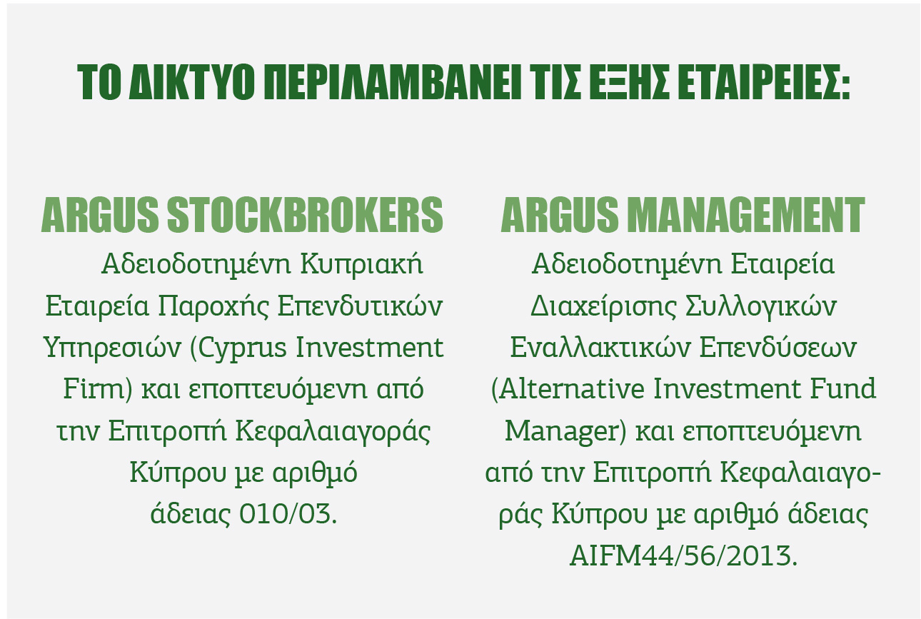 Η ARGUS αποτελεί ένα δίκτυο εποπτευόμενων εταιρειών που δραστηριοποιούνται στον τομέα των Χρηματοοικονομικών Υπηρεσιών, ενοποιημένων υπό το εμπορικό σήμα της ARGUS. Κάθε οντότητα ρυθμίζεται ανεξάρτητα βάσει του δικού της εποπτικού πλαισίου, διασφαλίζοντας πλήρη συμμόρφωση με τις εκάστοτε τοπικές νομικές και εποπτικές απαιτήσεις, ενώ ταυτόχρονα τηρεί τις κοινές αξίες, τα πρότυπα και τις αρχές εταιρικής διακυβέρνησης που χαρακτηρίζουν την ταυτότητα της ARGUS.