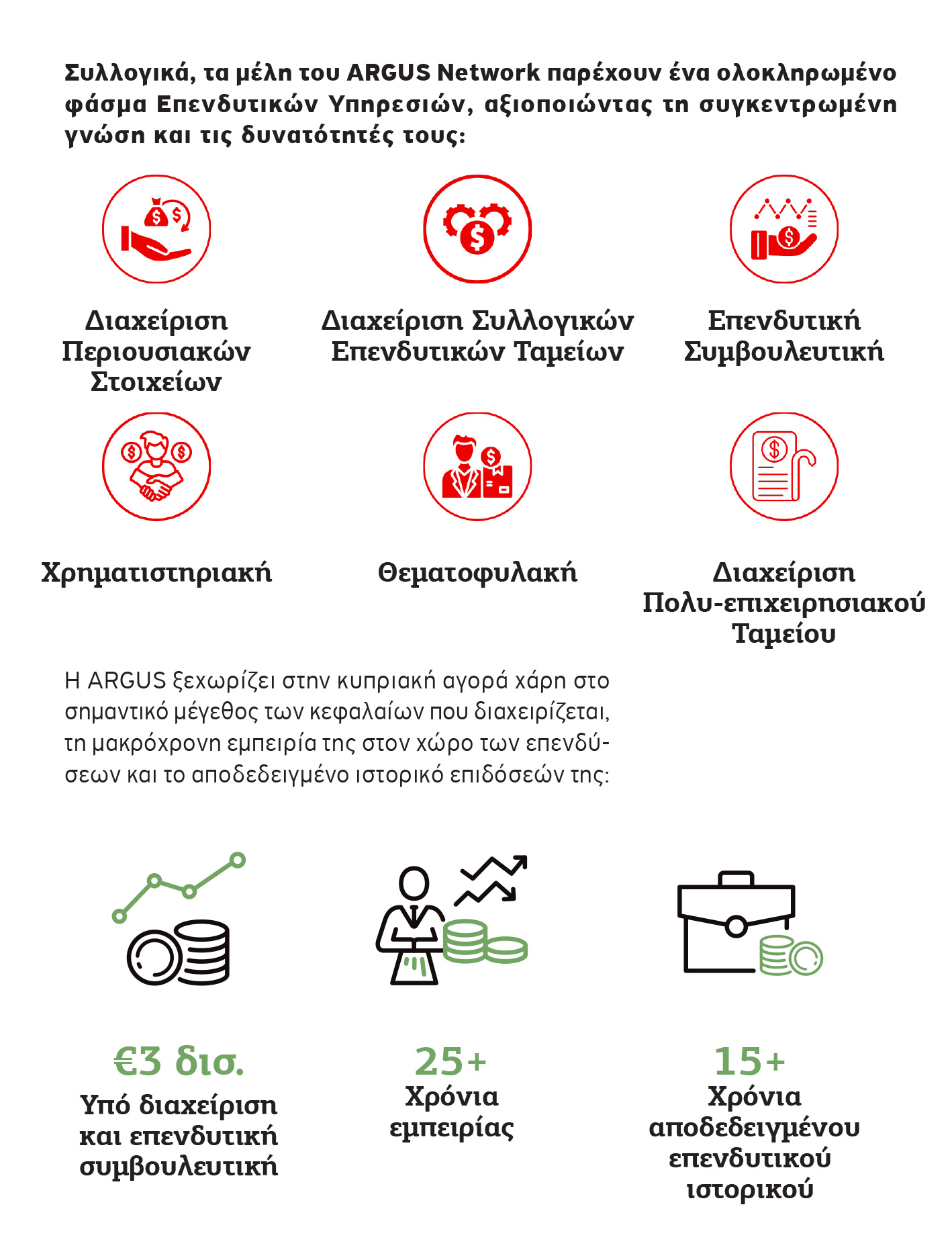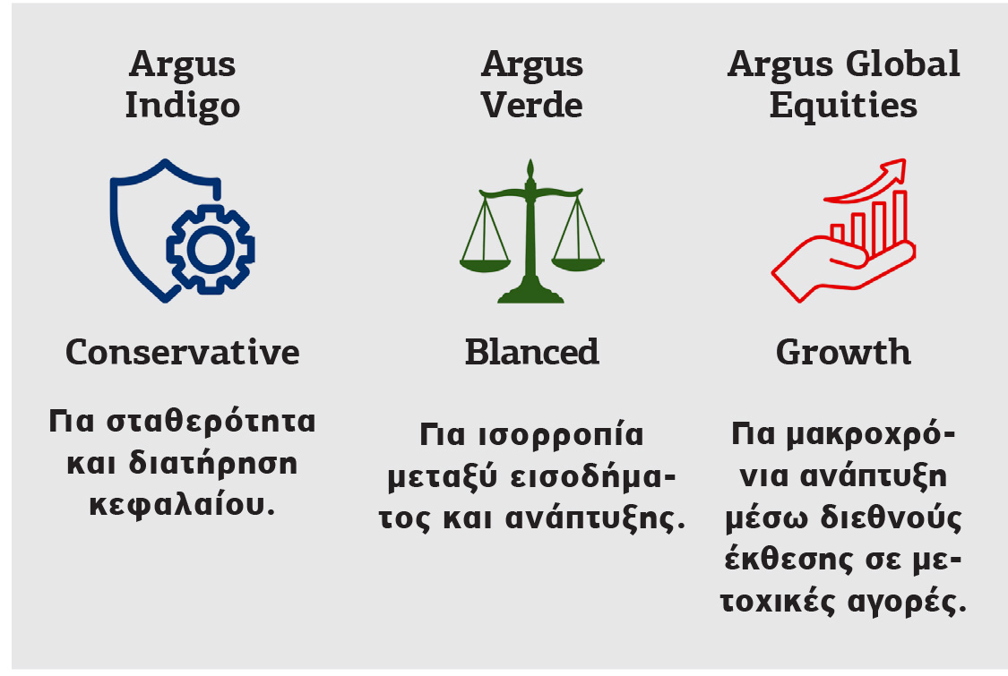 Η φιλοσοφία της ARGUS βασίζεται στη μακροχρόνια απόδοση, την υπεύθυνη επενδυτική λήψη αποφάσεων και τη συστηματική διαχείριση κινδύνου. Σε μια εποχή όπου η ταχύτητα των πληροφοριών και η μεταβλητότητα των αγορών αυξάνεται, η ARGUS κτίζει σχέσεις εμπιστοσύνης προσφέροντας διαφάνεια, συνέπεια και προσαρμοστικότητα.