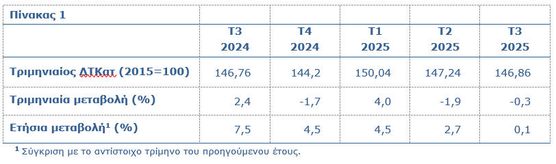 Συγκεκριμένα σύμφωνα με την προκαταρκτική εκτίμηση της Στατιστικής Υπηρεσίας, ο ΔΤΚατ για το τρίτο τρίμηνο του 2025, υπολογίζεται στις 146,86 μονάδες. Ως εκ τούτου σε σύγκριση με το δεύτερο τρίμηνο του 2025, ο ΔΤΚατ παρουσίασε μείωση κατά 0,3%, ενώ σε σχέση με το αντίστοιχο τρίμηνο του 2024 σημείωσε αύξηση κατά 0,1%. Πρόκειται για την μικρότερη ετήσια αύξηση από το 2022, περίοδο από την οποία ο Δείκτης καταγράφει συνεχή άνοδο.