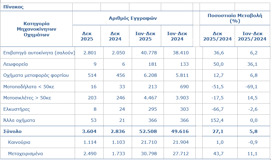 - (α) Ο συνολικός αριθμός των εγγραφέντων οχημάτων αυξήθηκε κατά 5,8% την περίοδο Ιανουαρίου- Δεκεμβρίου 2025 και έφτασε τις 52.508, σε σύγκριση με 49.616 κατά την ίδια περίοδο του 2024.