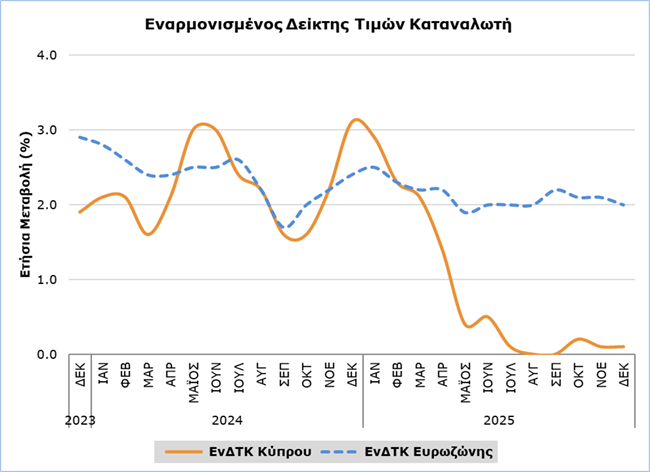 Ο Εναρμονισμένος Δείκτης Τιμών Καταναλωτή κατέγραψε αύξηση της τάξεως του 0,8% το 2025 (Ιανουαρίου – Δεκεμβρίου 2025), σε σύγκριση με την αντίστοιχη περσινή περίοδο, σύμφωνα με τα στοιχεία που δημοσίευσε σήμερα η Στατιστική Υπηρεσία.