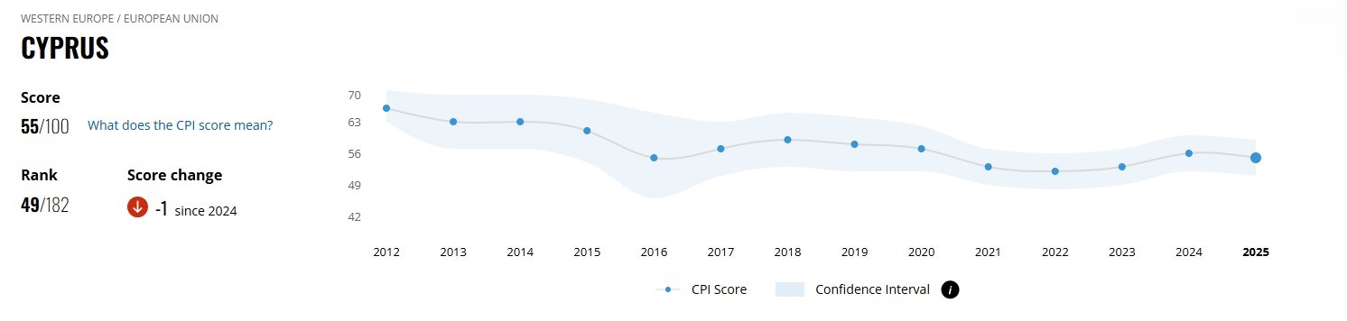Στην 49η θέση ανάμεσα σε 182 χώρες κατατάσσεται η Κύπρος στον Δείκτη Αντίληψης Διαφθοράς για το 2025, καταγράφοντας υποχώρηση τριών θέσεων σε σύγκριση με το προηγούμενο έτος.