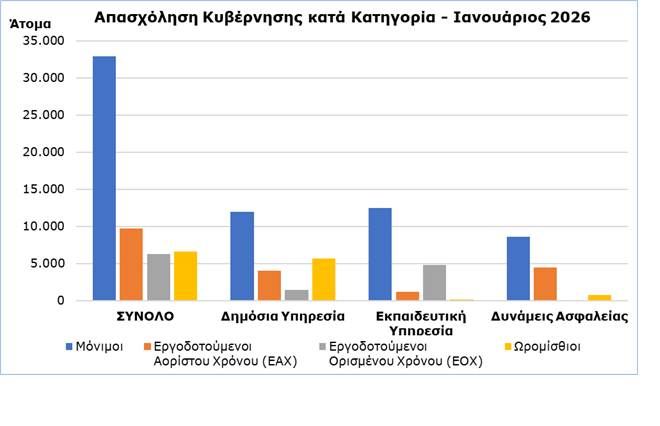 Στο σύνολο της Κυβέρνησης, η μεγαλύτερη αύξηση (1,4%) παρατηρείται στους Εργοδοτούμενους Αορίστου Χρόνου (ΕΑΧ) σε σύγκριση με τον Ιανουάριο του 2025 και η μεγαλύτερη μείωση (-0,8%) παρατηρείται στους Εργοδοτούμενους Ορισμένου Χρόνου (ΕΟΧ). Στις επί μέρους κατηγορίες προσωπικού ανά Υπηρεσία, η μεγαλύτερη ποσοστιαία αύξηση παρουσιάζεται στους ΕΑΧ της Εκπαιδευτικής Υπηρεσίας (24,4%) και η μεγαλύτερη ποσοστιαία μείωση στους EOX των Δυνάμεων Ασφαλείας (-86,3%).