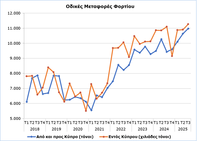 Κατά την περίοδο Ιουλίου-Σεπτεμβρίου 2025, το συνολικό βάρος των προϊόντων που μεταφέρθηκαν οδικώς εντός Κύπρου παρουσίασε αύξηση 1,4% σε σύγκριση με την αντίστοιχη περίοδο του 2024, ενώ το βάρος του φορτίου που μεταφέρθηκε οδικώς από και προς την Κύπρο επίσης σημείωσε αύξηση 16,4%.