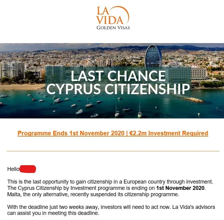 Αυτή είναι η τελευταία ευκαιρία να πάρετε υπηκοότητα σε χώρα της Ευρωπαϊκής Ένωσης μέσω επένδυσης. Η παραχώρηση κυπριακής υπηκοότητας μέσω του Επενδυτικού Προγράμματος τελειώνει την 1η Νοεμβρίου 2020, με την Μάλτα που ήταν η εναλλακτική επιλογή να έχει αναβάλει πρόσφατα το πρόγραμμα πολιτογράφησης.