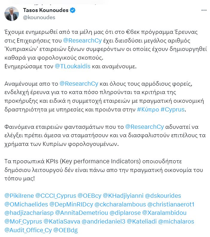 Για μεγάλο αριθμό ξένων εταιρειών που απεικονίζονται στα χαρτιά ως «κυπριακές» και που φέρονται να έχουν διεισδύσει σε προγράμματα του Ιδρύματος Έρευνας και Καινοτομίας, διεκδικώντας χρηματοδότηση, έκανε λόγο ο Διευθυντής της Signal GeneriX, Δρ. Τάσος Κουνούδης, με χθεσινή του ανάρτηση στα Μέσα Κοινωνικής Δικτύωσης.
