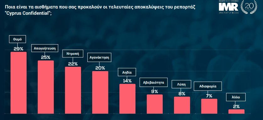 Παρόλα αυτά, ως κυρίαρχο συναίσθημα γύρω από τις αποκαλύψεις αναδείχθηκε ο θυμός (29%), ακολουθούμενο από την απογοήτευση (25%) και την ντροπή (22%).