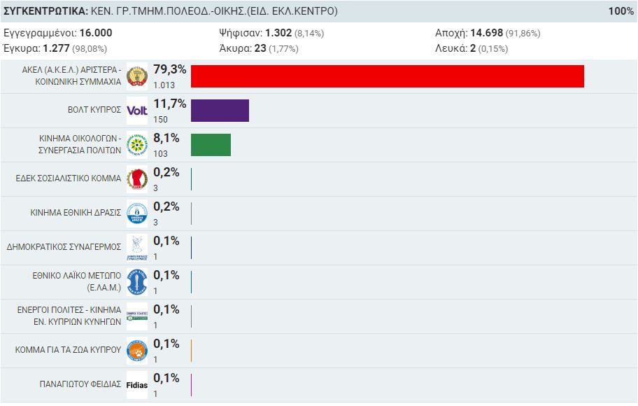 Το ΑΚΕΛ επέλεξαν συνολικά 3.885 Τουρκοκύπριοι, ενώ δεύτερο σε σταυρούς προτίμησης αναδείχθηκε το Βολτ, συγκεντρώνοντας 621 ψήφους. Στην τρίτη θέση κατατάσσεται το Κίνημα Οικολόγων - Συνεργασία Πολιτών, το οποίο έλαβε 290 ψήφους από τα ειδικά εκλογικά κέντρα.