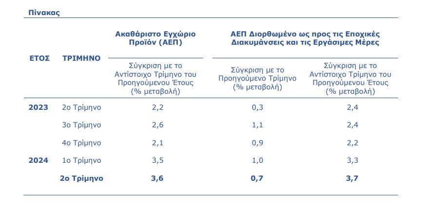 Ο ρυθμός ανάπτυξης της οικονομίας κατά το δεύτερο τρίμηνο του 2024 είναι θετικός και υπολογίζεται σε 3,6% σε σύγκριση με το αντίστοιχο τρίμηνο του 2023, σύμφωνα με προκαταρκτική εκτίμηση της Στατιστικής Υπηρεσίας που δημοσιεύθηκε σήμερα. Μετά τη διόρθωση του ΑΕΠ ως προς τις εποχικές διακυμάνσεις και τις εργάσιμες μέρες, ο ρυθμός ανάπτυξης υπολογίζεται στο 3,7%. Η αύξηση του ρυθμού ανάπτυξης είναι η μεγαλύτερη που σημειώθηκε από το 3ο τρίμηνο του 2022.