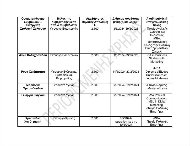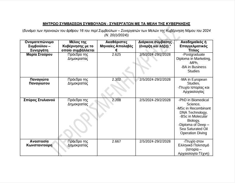 Tα ονόματα των συμβούλων και συνεργατών των υπουργών, των υφυπουργών, καθώς και του Προέδρου της Δημοκρατίας, δημοσιοποίησε το Προεδρικό. Υπενθυμίζεται πως στο παρελθόν είχε προκληθεί μεγάλος θόρυβος, με την κυβέρνηση να δέχεται επικρίσεις, μετά από την απόφαση της να μην δημοσιοποιήσει πλήρως τα ονόματα, παρά μόνο τα αρχικά, δημιουργώντας ένα "πέπλο μυστηρίου" γύρω από το τι ισχύει με τους συμβούλους και τους συνεργάτες των μελών της Κυβέρνησης.